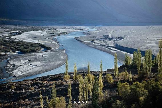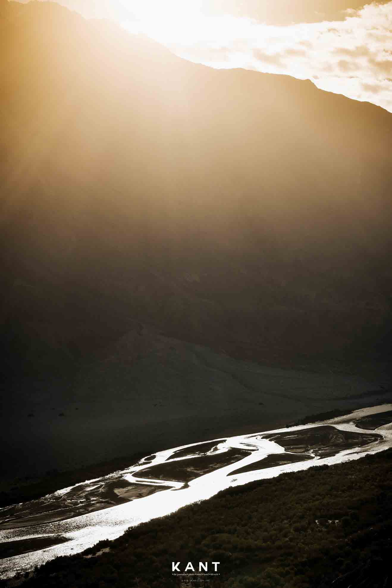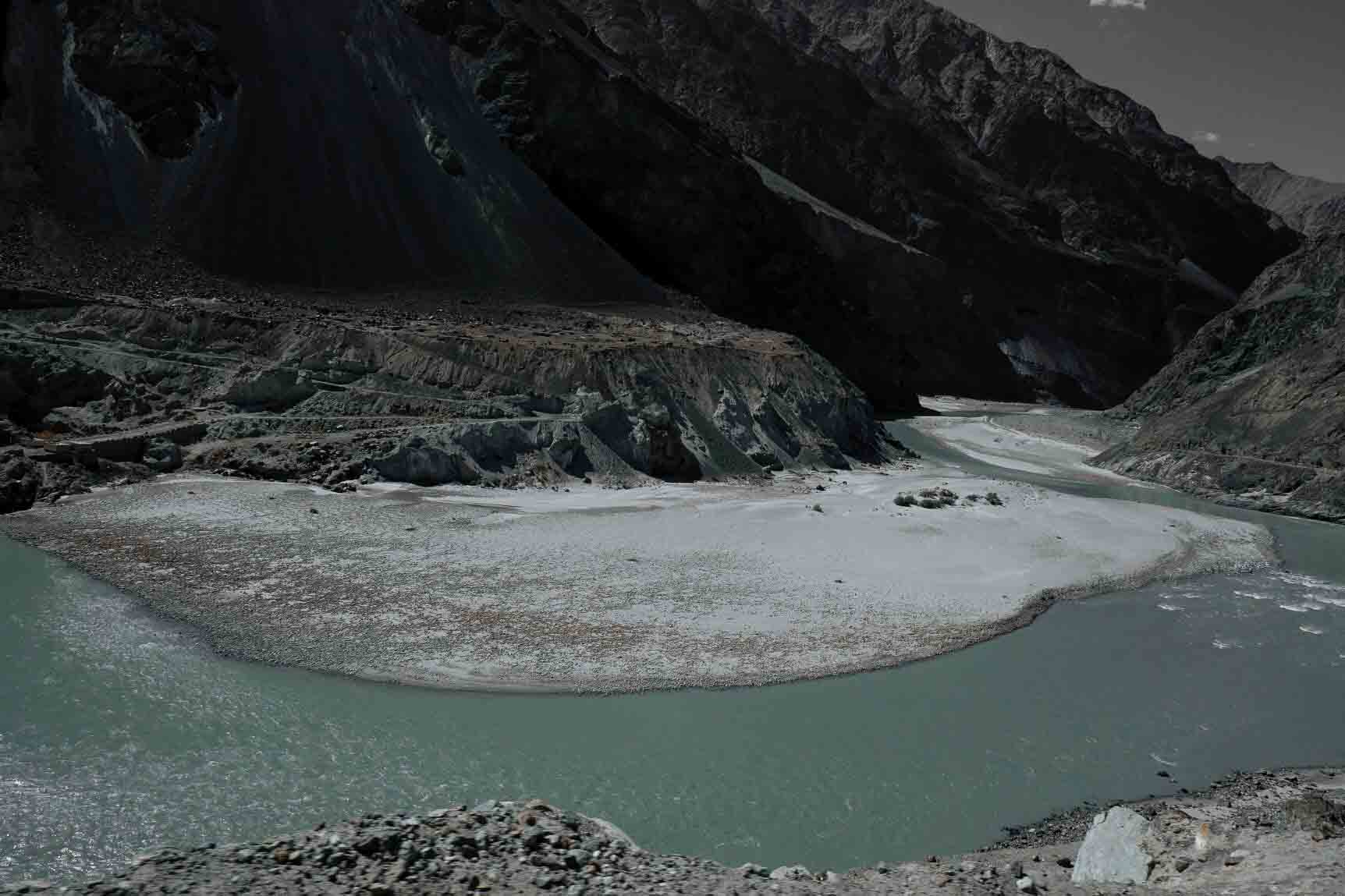 บรรยากาศสองข้างทางขนาบด้วยภูเขาลูกใหญ่ และเแม่น้ำ Shyok แม่น้ำสายหลักที่ไหลไปยังปากีสถาน น้ำค่อนข้างเชี่ยว รถจะขับเลาะภูเขาสลับกับขับขนานแม่น้ำไปเรื่อยๆ น้ำเชี่ยวมากๆ เรากำลังตื่นตาตื่นใจกับบรรยากาศ 2 ข้างทาง