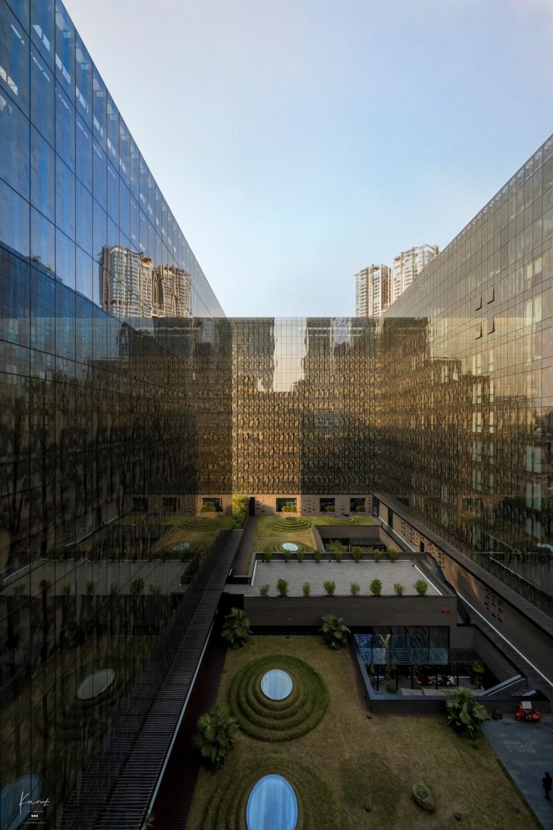 Make Architects ออกแบบ เนินหญ้าวงกลมซ้อนเป็นขั้นบันได จำนวน 4 จุดในลานกลาง แต่ละจุดมี skylight วงกลมอยู่ตรงกลาง ทำหน้าที่ส่งแสงธรรมชาติลงไปยังพื้นที่ใต้ดิน ทั้งที่ สระว่ายน้ำ, สปา, ห้องอาหาร Tivano แนวคิดนี้ได้แรงบันดาลใจจาก นาขั้นบันไดของเสฉวนที่ปลูกข้าวบนไหล่เขาชัน