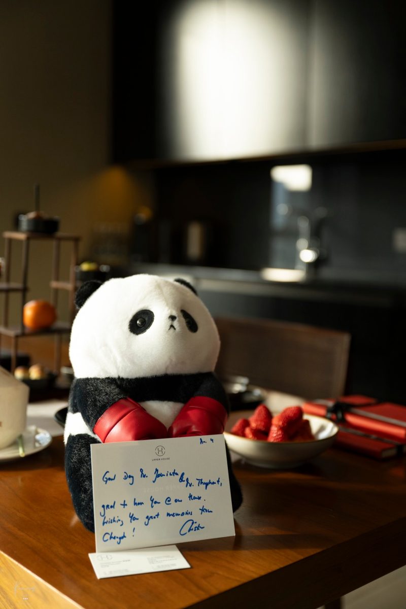การ์ดต้อนรับวางไว้บนโต๊ะ พร้อมน้องหมีแพนด้า ฑูตวัฒนธรรมประจำเฉิงตู