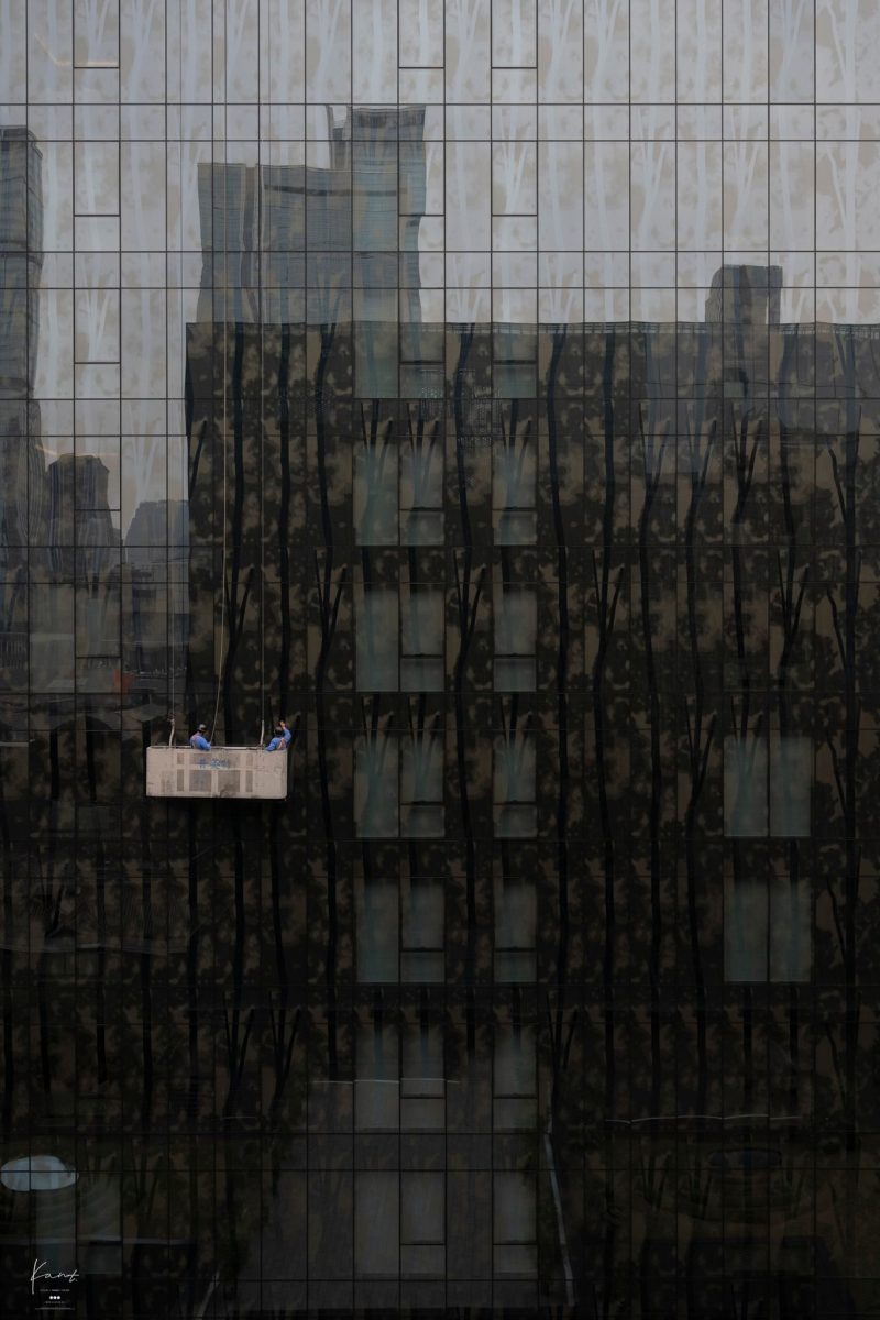 ผนังของอาคารเป็นกระจกเงา ถ้ามองดีๆ จะเห็นว่าซ่อนลวดลายของต้นไผ่เอาไว้ด้านใน