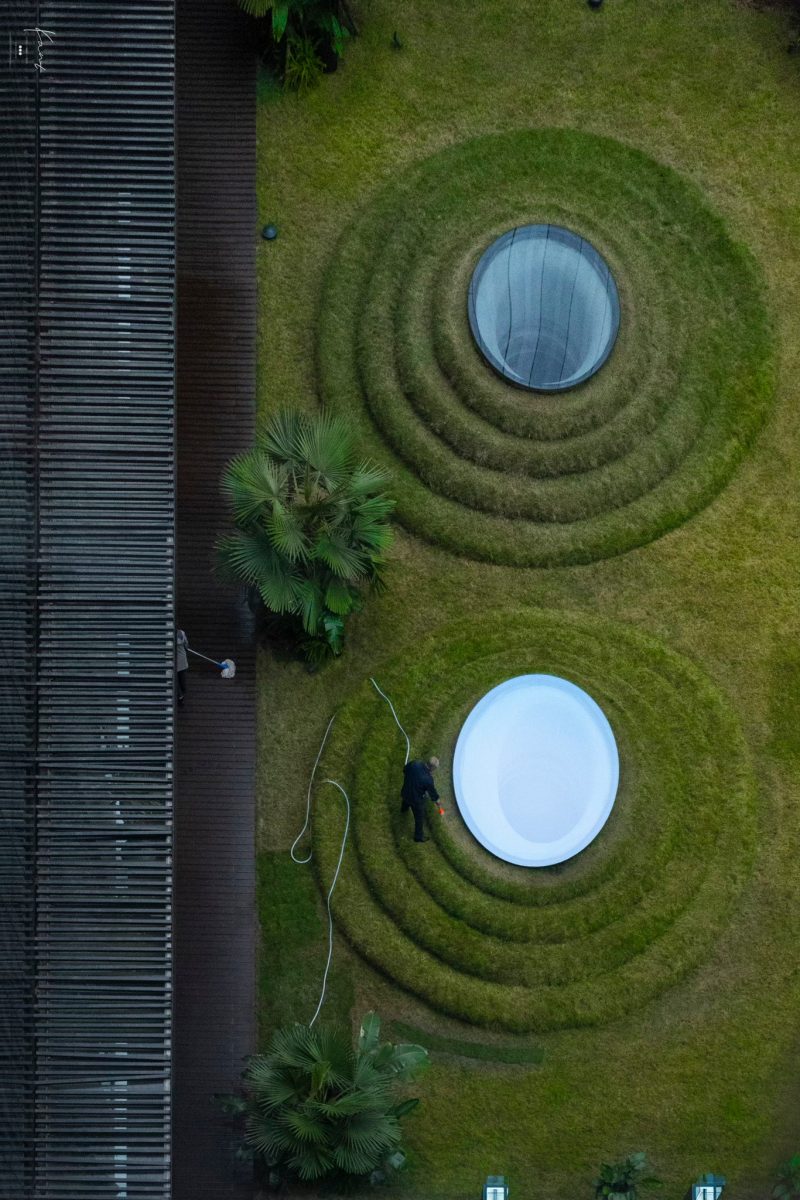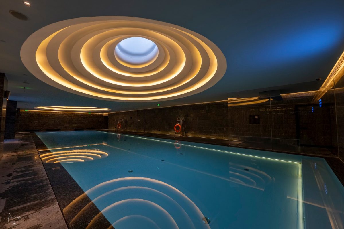 สระว่ายน้ำในร่ม มองขึ้นไปยัง Skylight นี่คือด้านล่างของเนินหญ้าวงกลมซ้อนชั้นที่เห็นจากภาพ drone สิ่งที่ด้านบนเป็นเนินหญ้าขั้นบันไดกลางลานสวน เมื่อมองจากด้านล่างขึ้นไปกลับกลายเป็น เพดานประติมากรรมทรงวงแหวนซ้อนกัน ส่องแสงอำพันอุ่นๆ ลงมาสะท้อนบนผิวน้ำสีเทอร์คอยซ์ของสระ 25 เมตร ตรงกลางสุดคือ skylight ทรงโดมที่ส่งแสงธรรมชาติลงมา เมื่อมองจากใต้ดินขึ้นไป รูปทรงขั้นบันไดเหล่านี้จะชวนให้นึกถึงนาขั้นบันไดบนไหล่เขาชันของเสฉวน