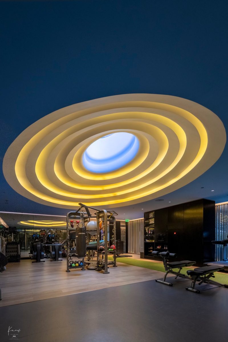 ฟิตเนสที่อยู่ติดกัน มองขึ้นไปยัง Skylight ทรงวงแหวนแสดงให้เห็นว่าเนินหญ้าแต่ละจุดบนลานสวนทำหน้าที่ส่งแสงลงมายังพื้นที่ใช้งานที่แตกต่างกันในชั้นใต้ดิน