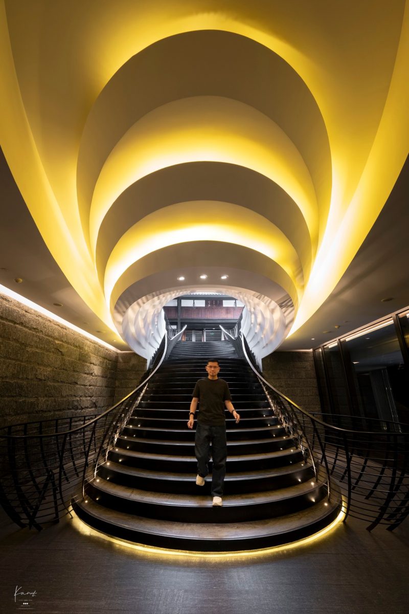 อีกหนึ่งมุมถ่ายรูปคือ Grand Staircase เป็น บันไดใหญ่ที่เชื่อมชั้นล็อบบี้ลงสู่ชั้นลานกลาง ออกแบบให้เป็น เพดานโค้งซ้อนกันเป็นชั้นๆ ส่องแสงอำพันลงมาตามขั้น ให้ความรู้สึกเหมือนเดินลงไปในหุบเขาที่ค่อยๆ แคบลง ปลายทางมองเห็นโครงสร้างไม้ของอาคาร heritage ด้านบน เป็นการเชื่อมโลกร่วมสมัยใต้ดินเข้ากับโลกราชวงศ์ชิงบนดินได้อย่างไร้รอยต่อ