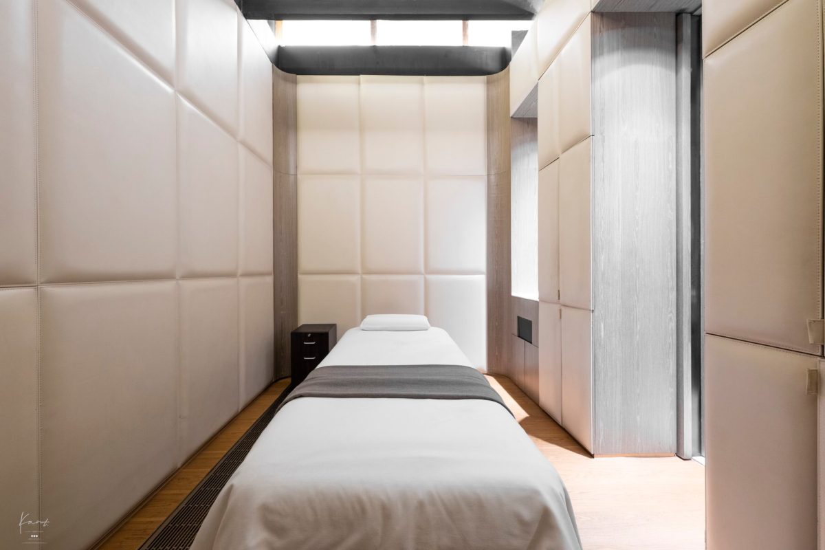 ห้องทรีตเมนต์ของ Mi Xun Spa ผนังบุหนังสีครีมนุ่มทั้งห้อง ให้ความรู้สึกเหมือนถูกห่อหุ้มด้วยความเงียบสงบ ดีไซน์เรียบสะอาดแต่อบอุ่น มีทั้งเตียงทรีตเมนต์ อ่างล้างหน้า มุมนั่งพัก และห้องน้ำส่วนตัวพร้อมเสื้อคลุมอาบน้ำ ผนังบุหนังสีครีมเหมือนกัน ตกแต่งด้วยไม้โอ๊คอ่อน