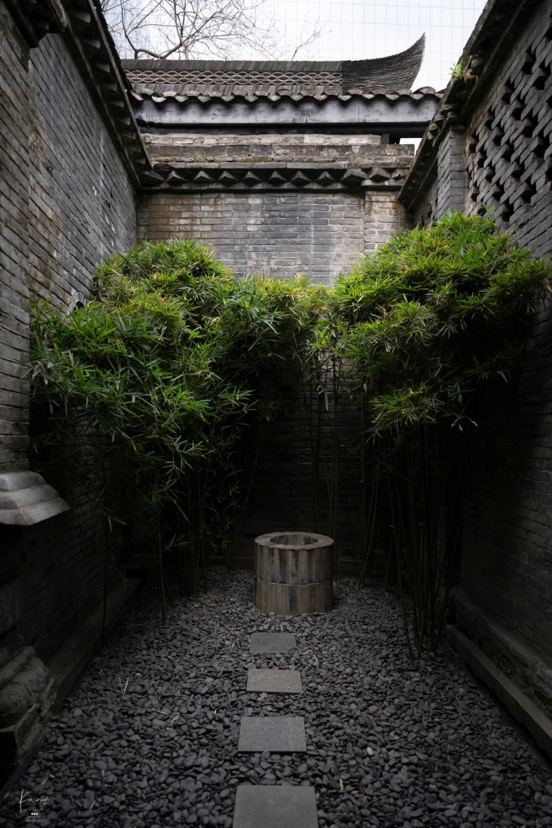 มุมลับในอาคาร heritage เป็นลานเล็กๆ ระหว่างกำแพงอิฐเก่า มีกอไผ่ล้อมรอบ ถังไม้โบราณตรงกลาง พื้นปูกรวดดำ ทางเดินหินแผ่นนำสายตา หลังคากระเบื้องจีนโค้งอยู่ด้านบน หลังจากที่เราทำ Meditation เสร็จ ก็มาโยนเหรียญกันที่นี่ครับ
