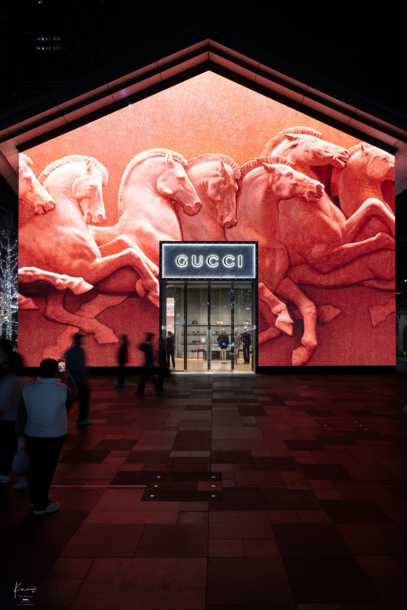 Gucci ก็ไม่น้อยหน้า ใช้ facade ขนาดยักษ์เป็นจอ LED แสดงภาพม้าศิลปะสีแดงสด ครอบอาคารทรงจั่วสไตล์จีน ตัดกับประตูกระจกสมัยใหม่ เป็นอีกตัวอย่างของ Taikoo Li ที่ให้แบรนด์หรูเข้ามาเล่นกับสถาปัตยกรรมท้องถิ่นอย่างอิสระ