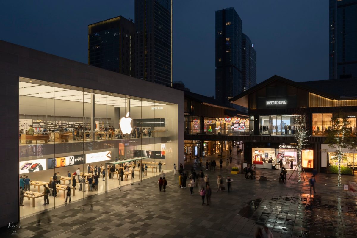 Apple Store ที่ใหญ่มาก ต้องเดินมาดูของกันสักหน่อย ภาพมุมกว้างเห็นบรรยากาศ open-air ของ Taikoo Li ยามค่ำ ผู้คนเดินไปมาระหว่างอาคาร ทุกอย่างเปิดโล่งไม่มีหลังคาคลุม ต่างจากห้างปิดทั่วไป