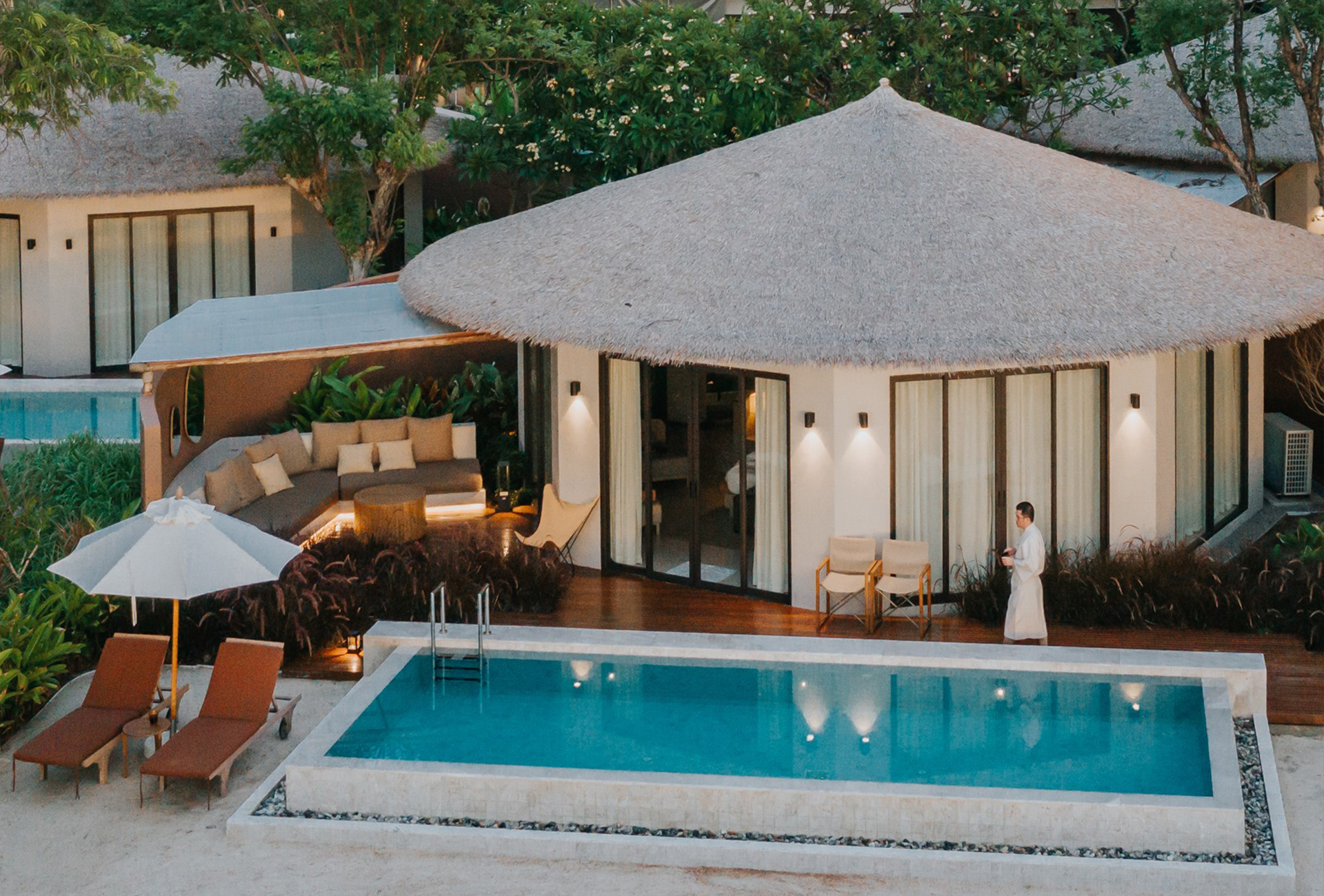กานต์พัก Beachfront Pool Villa หมายเลข 2 ครับ ตั้งอยู่ด้านหน้าสุดของชายหาด เราสามารถชมวิวทะเลได้จากภายในห้องพักกันเลยทีเดียว ด้านนอกยังมีสระว่ายน้ำระบบเกลือส่วนตัว ขนาด 2.8 X 1.8 เมตร ด้านข้างมีพื้นที่สวนและศาลา เป็นมุมที่ผมชอบมา outdoor นั่งอ่านหนังสือ จิบชากาแฟ ที่นี่มีบัตเลอร์เซอร์วิส ตลอดระยะเวลาที่เข้าพักด้วยนะครับ เรียกว่า V-Verse ของผมเป็นน้องแตงครับ ดูแลดีมาก